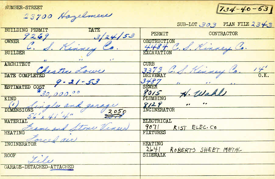 23700 Hazelmere Road Shaker Heights, OH 44122 PARCEL ID: 734-40-053 Building Permit Date: 03-24-1953 Plan File Number: 2343 Microfilm Roll: Roll#34 Neighborhood: Mercer Owner: C.S. Kinney Company Builder: C.S. Kinney Company Architect: Lowe, Chester Estimated Cost: 30000 Date Completed: 09-21-1953 Kind: Single Dwelling and Garage Material: Frame and Stone Veneer Heating: Forced Air Roof: Tile Garage: attached |