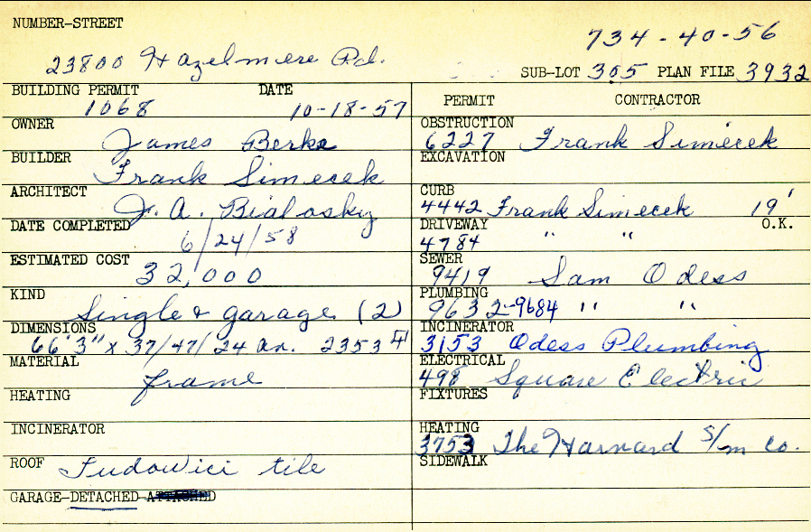 23800 Hazelmere Road Shaker Heights, OH 44122 PARCEL ID: 734-40-056 Building Permit Date: 10-18-1957 Plan File Number: 3932 Neighborhood: Mercer Owner: Berke, James Builder: Simecek, Frank Architect: Bialosky, Jack A. Estimated Cost: 32000 Kind: Single Dwelling and Garage (2) Material: Frame Roof: Tile Garage: detached |