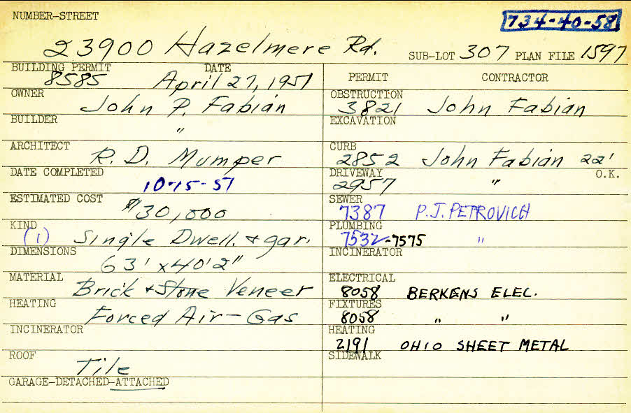 23900 Hazelmere Road Shaker Heights, OH 44122 PARCEL ID: 734-40-058 Building Permit Date: 04-27-1951 Plan File Number: 1597 all scanned Microfilm Roll: Roll025 Neighborhood: Mercer Owner: Fabian, John P. Builder: Fabian, John P. Architect: Mumper, R. D. Estimated Cost: 30000 Date Completed: 10-15-1951 Kind: Single Dwelling and Garage Material: Brick and Stone Veneer Heating: Forced Air - Gas Roof: Tile Garage: attached Blueprints: online, see link above |