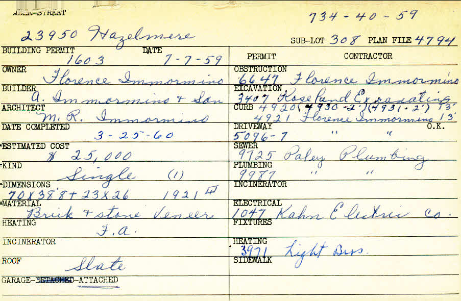 23950 Hazelmere Road Shaker Heights, OH 44122 PARCEL ID: 734-40-059 Building Permit Date: 07-07-1959 Plan File Number: 4794 Microfilm Roll: Roll#66 Neighborhood: Mercer Owner: Immormino, Florence Builder: A. Immormino and Son Architect: Immormino, M. R. Estimated Cost: 25000 Date Completed: 03-25-1960 Kind: Single, Single Residence or Dwelling Material: Brick and Stone Veneer Heating: Forced Air Roof: Slate Garage: attached |