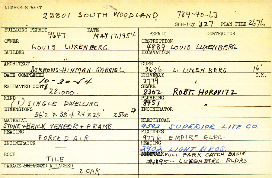 23801 South Woodland Road Shaker Heights, OH 44122 PARCEL ID: 734-40-063 Building Permit Date: 05-17-1954 Plan File Number: 2676 Microfilm Roll: Roll #37 Neighborhood: Mercer Owner: Luxenberg, Louis Builder: Luxenberg, Louis Architect: Burrows, Hinman, Gabriel Estimated Cost: 28000 Date Completed: 10-20-1954 Kind: Single, Single Residence or Dwelling Material: Stone and Brick Veneer and Frame Heating: Forced Air Roof: Tile Garage: attached 2 car |