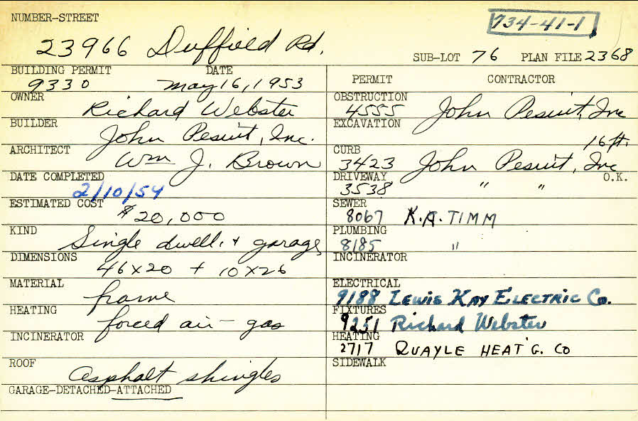 23966 Duffield Road Shaker Heights, OH 44122 PARCEL ID: 734-41-001 Building Permit Date: 05-16-1953 Plan File Number: 2368, 9717 Microfilm Roll: Roll#34, Roll#104 Neighborhood: Mercer Owner: Webster, Richard Builder: John Pesuit Inc Architect: Brown, William J. Estimated Cost: 20000 Date Completed: 02-10-1954 Kind: Single Dwelling and Garage Material: Frame Heating: Forced Air - Gas Roof: Asphalt Shingles Garage: attached |