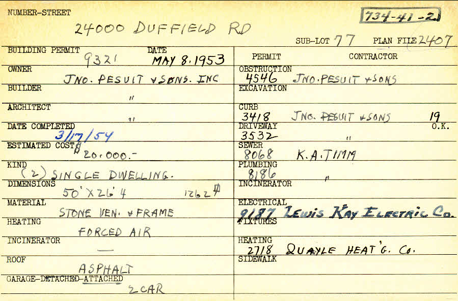 24000 Duffield Road Shaker Heights, OH 44122 PARCEL ID: 734-41-002 Building Permit Date: 05-08-1953 Plan File Number: 2407 scanned, 11820 Microfilm Roll: Roll035, NewRoll#9 Neighborhood: Mercer Owner: John Pesuit and Sons Inc Builder: John Pesuit and Sons Inc Architect: Jno. Pesuit and Sons Inc Estimated Cost: 20000 Date Completed: 03-17-1954 Kind: Single, Single Residence or Dwelling (2) Material: Stone Veneer and Frame Heating: Forced Air Roof: Asphalt Garage: attached 2 car |