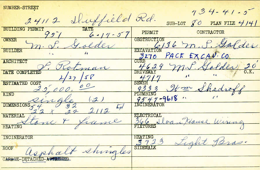 24112 Duffield Road Shaker Heights, OH 44122 PARCEL ID: 734-41-005 Building Permit Date: 06-17-1957 Plan File Number: 4141, 3548, 6768 Microfilm Roll: Roll#61, Roll#52, Roll#88 Neighborhood: Mercer Owner: Golder, M. L. Builder: Golder, M. L. Architect: Rotman, L. Estimated Cost: 25000 Date Completed: 02-27-1958 Kind: Single, Single Residence or Dwelling (2) Material: Stone and Frame Roof: Asphalt Shingles Garage: detached |