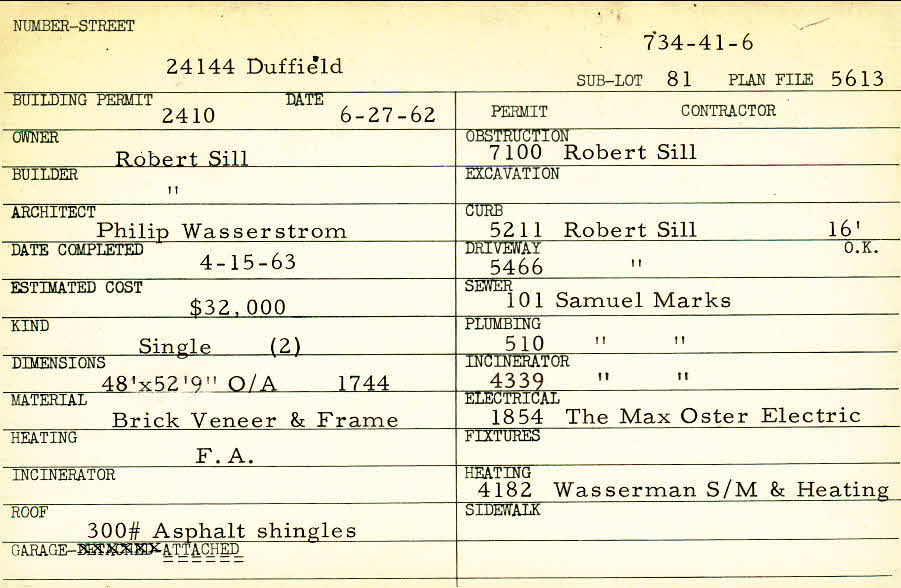 24144 Duffield Road Shaker Heights, OH 44122 PARCEL ID: 734-41-006 Building Permit Date: 06-27-1962 Plan File Number: 5613 Microfilm Roll: Roll#76 Neighborhood: Mercer Owner: Sill, Robert Builder: Sill, Robert Architect: Wasserstrom, Philip Estimated Cost: 32000 Date Completed: 04-15-1963 Kind: Single, Single Residence or Dwelling (2) Material: Brick Veneer and Frame Heating: Forced Air Roof: 300# Min Asphalt Garage: attached |
