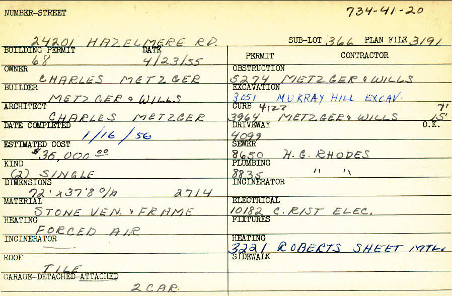 24201 Hazelmere Road Shaker Heights, OH 44122 PARCEL ID: 734-41-020 Building Permit Date: 04-23-1955 Plan File Number: 3191 Microfilm Roll: Roll#44 Neighborhood: Mercer Owner: Metzger, Charles Builder: Metzger and Wills Architect: Metzger, Charles A. Estimated Cost: 35000 Date Completed: 01-16-1956 Kind: Single, Single Residence or Dwelling (2) Material: Stone Veneer and Frame Heating: Forced Air Roof: Tile Garage: attached 2 car |