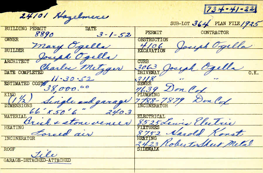 24101 Hazelmere Road Shaker Heights, OH 44122 PARCEL ID: 734-41-022 Building Permit Date: 03-01-1952 Plan File Number: 1925 all scanned Microfilm Roll: Roll029 Neighborhood: Mercer Owner: Ogella, Mary Builder: Ogella, Joseph Architect: Metzger, Charles A. Estimated Cost: 38000 Date Completed: 11-30-1952 Kind: Single Dwelling and Garage Material: Brick and Stone Veneer Heating: Forced Air Roof: Tile Garage: attached |