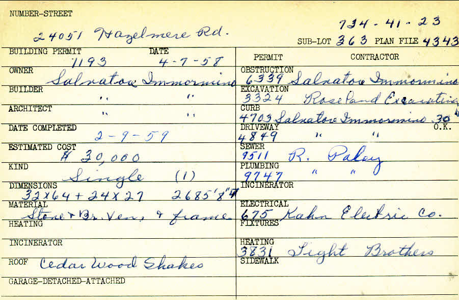 24051 Hazelmere Road Shaker Heights, OH 44122 PARCEL ID: 734-41-023 Building Permit Date: 04-07-1958 Plan File Number: 4343 Neighborhood: Mercer Owner: Immormino, Salvatore Builder: Immormino, Salvatore Architect: Immormino, Salvatore Estimated Cost: 30000 Date Completed: 02-09-1959 Kind: Single, Single Residence or Dwelling Material: Stone and Brick Veneer and Frame Roof: Wood Shakes Card Available: yes |