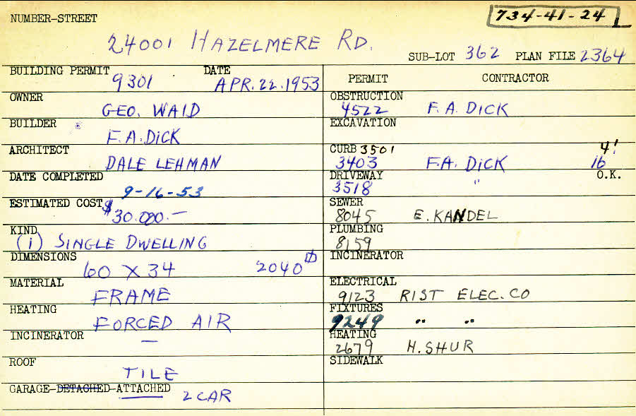 24001 Hazelmere Road Shaker Heights, OH 44122 PARCEL ID: 734-41-024 Building Permit Date: 04-22-1953 Plan File Number: 2364, 10041 Microfilm Roll: Roll#34, Roll#105 Neighborhood: Mercer Owner: Waid, George Builder: Dick, F. A. Architect: Lehman, Dale Estimated Cost: 30000 Date Completed: 09-16-1953 Kind: Single, Single Residence or Dwelling Material: Frame Heating: Forced Air Roof: Tile Garage: attached 2 car |