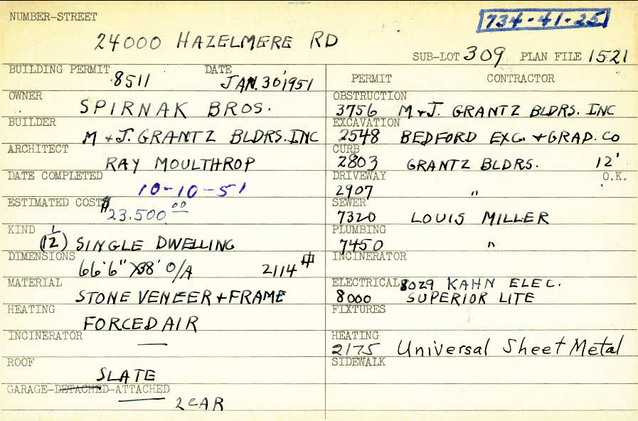 24000 Hazelmere Road Shaker Heights, OH 44122 PARCEL ID: 734-41-025 Building Permit Date: 01-30-1951 Plan File Number: 1521 all scanned Microfilm Roll: Roll024 Neighborhood: Mercer Owner: Spirnak Brothers Builder: M and J. Grantz Builders Inc. Architect: Moulthrop, Ray Estimated Cost: 23500 Date Completed: 10-10-1951 Kind: Single, Single Residence or Dwelling Material: Stone Veneer and Frame Heating: Forced Air Roof: Slate Garage: attached 2 car |