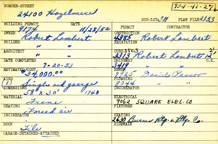 24100 Hazelmere Road Shaker Heights, OH 44122 PARCEL ID: 734-41-027 Building Permit Date: 11-28-1952 Plan File Number: 2133 Microfilm Roll: Roll#32 Neighborhood: Mercer Owner: Lambert, Robert Builder: Lambert, Robert Architect: Lambert, Robert Estimated Cost: 34000 Date Completed: 07-20-1953 Kind: Single Dwelling and Garage Material: Frame Heating: Forced Air Roof: Tile Garage: attached |