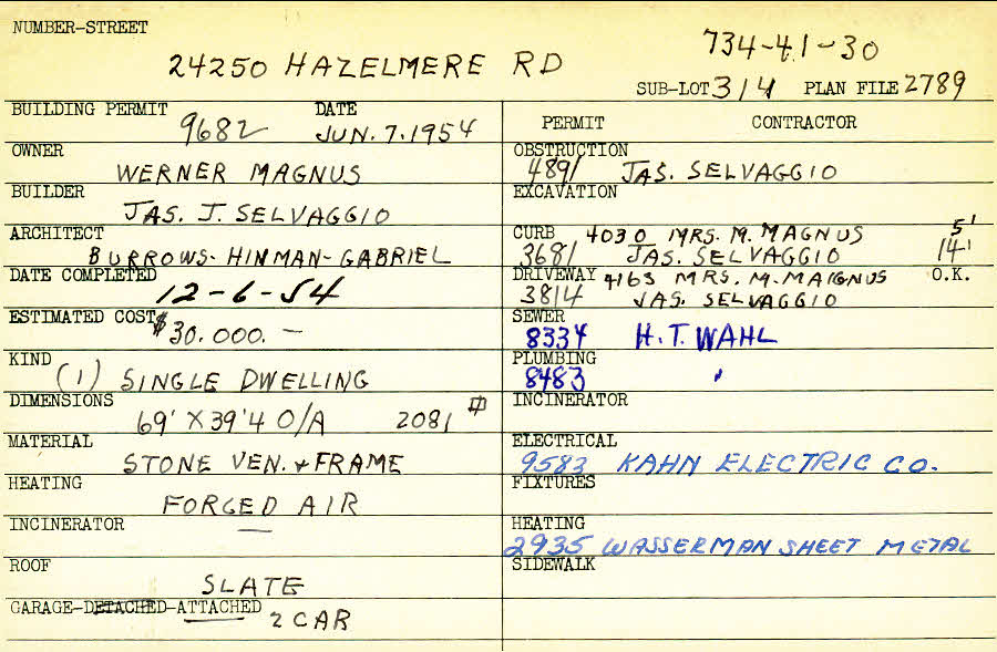 24250 Hazelmere Road Shaker Heights, OH 44122 PARCEL ID: 734-41-030 Building Permit Date: 06-07-1954 Plan File Number: 2789, 6926 Microfilm Roll: Roll #38, Roll#90 Neighborhood: Mercer Owner: Magnus, Werner Builder: Selvaggio, James J. Architect: Burrows, Hinman, Gabriel Estimated Cost: 30000 Date Completed: 12-06-1954 Kind: Single, Single Residence or Dwelling Material: Stone Veneer and Frame Heating: Forced Air Roof: Slate Garage: attached 2 car |
