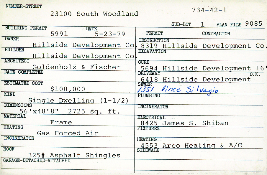23100 South Woodland Road Shaker Heights, OH 44122 PARCEL ID: 734-42-001 Building Permit Date: 05-23-1979 Plan File Number: 9085 Microfilm Roll: Roll#100 Neighborhood: Mercer Owner: Hillside Development Company Builder: Hillside Development Company Architect: Goldenholz and Fischer Estimated Cost: 100000 Kind: Single, Single Residence or Dwelling Material: Frame Heating: Forced Air - Gas Roof: 325# Asphalt |