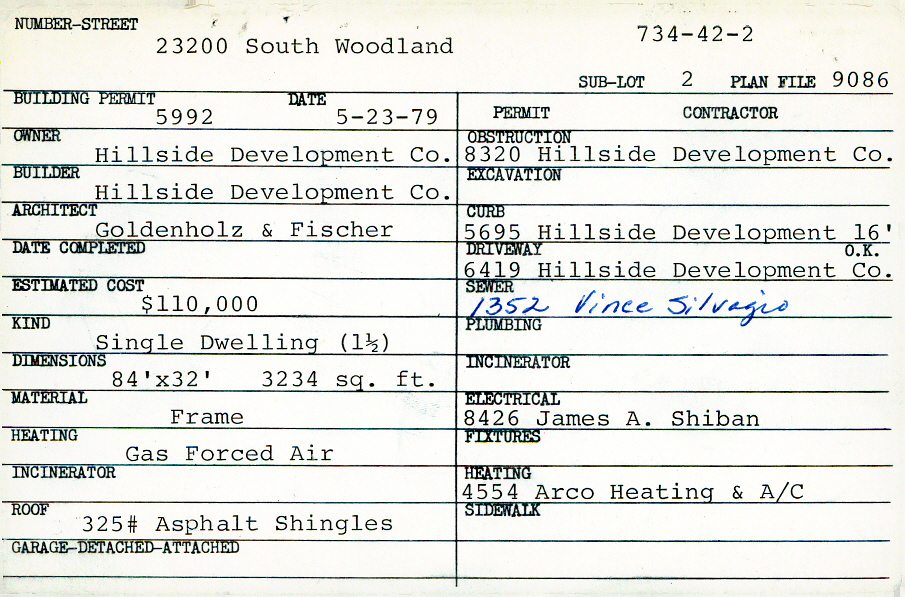 23200 South Woodland Road Shaker Heights, OH 44122 PARCEL ID: 734-42-002 Building Permit Date: 05-23-1979 Plan File Number: 9086 Microfilm Roll: Roll#100 Neighborhood: Mercer Owner: Hillside Development Company Builder: Hillside Development Company Architect: Goldenholz and Fischer Estimated Cost: 110000 Kind: Single, Single Residence or Dwelling Material: Frame Heating: Forced Air - Gas Roof: 325# Asphalt |
