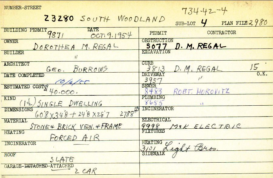 23280 South Woodland Road Shaker Heights, OH 44122 PARCEL ID: 734-42-004 Building Permit Date: 10-09-1954 Plan File Number: 2980 Microfilm Roll: Roll#42 Neighborhood: Mercer Owner: Regal, Dorothea M. Builder: Regal, Dorothea M. Architect: Burrows, George Estimated Cost: 40000 Date Completed: 10-06-1955 Kind: Single, Single Residence or Dwelling Material: Stone and Brick Veneer and Frame Heating: Forced Air Roof: Slate Garage: attached 2 car |