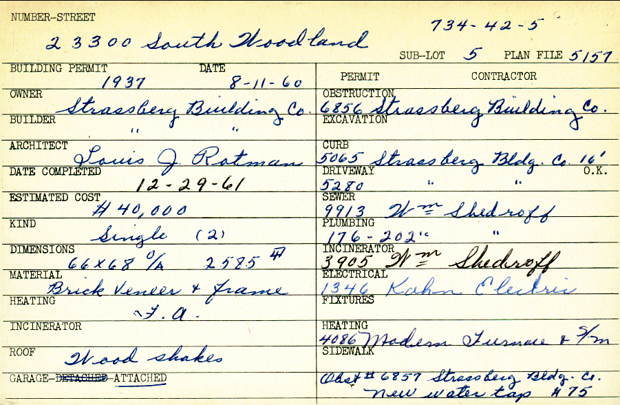 23300 South Woodland Road Shaker Heights, OH 44122 PARCEL ID: 734-42-005 Building Permit Date: 08-11-1960 Plan File Number: 5157, 5594, 5596 Microfilm Roll: Roll#70, Roll#76 Neighborhood: Mercer Owner: Strassberg Building Company Builder: Strassberg Building Company Architect: Rotman, Louis J. Estimated Cost: 40000 Date Completed: 12-29-1961 Kind: Single, Single Residence or Dwelling (2) Material: Brick Veneer and Frame Heating: Forced Air Roof: Wood Shakes Garage: attached |