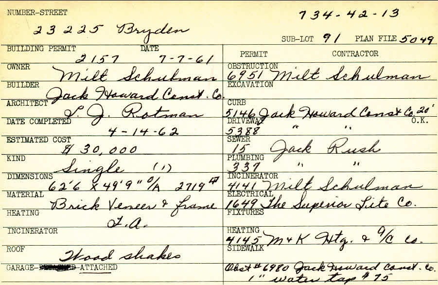 23225 Bryden Road Shaker Heights, OH 44122 PARCEL ID: 734-42-013 Building Permit Date: 07-07-1961 Plan File Number: 5049 Microfilm Roll: Roll#69 Neighborhood: Mercer Owner: Schulman, Milt Builder: Jack Howard Construction Company Architect: Rotman, L. J. Estimated Cost: 30000 Date Completed: 04-14-1962 Kind: Single, Single Residence or Dwelling Material: Brick Veneer and Frame Heating: Forced Air Roof: Wood Shakes Garage: attached |