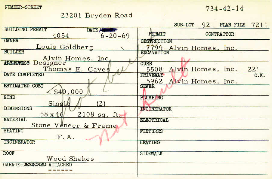 23201 Bryden Road Shaker Heights, OH 44122 PARCEL ID: 734-42-014 Building Permit Date: 06-20-1969 Plan File Number: 5822, 7211, 8060 Microfilm Roll: Roll#79, Roll#92, Roll#97, Roll#99 Neighborhood: Mercer Owner: Goldberg, Louis Builder: Alvin Homes, Inc. Architect: Caves, Thomas E. (Designer) Estimated Cost: 40000 Kind: Single, Single Residence or Dwelling (2) Material: Stone Veneer and Frame Heating: Forced Air Roof: Wood Shakes Garage: attached |