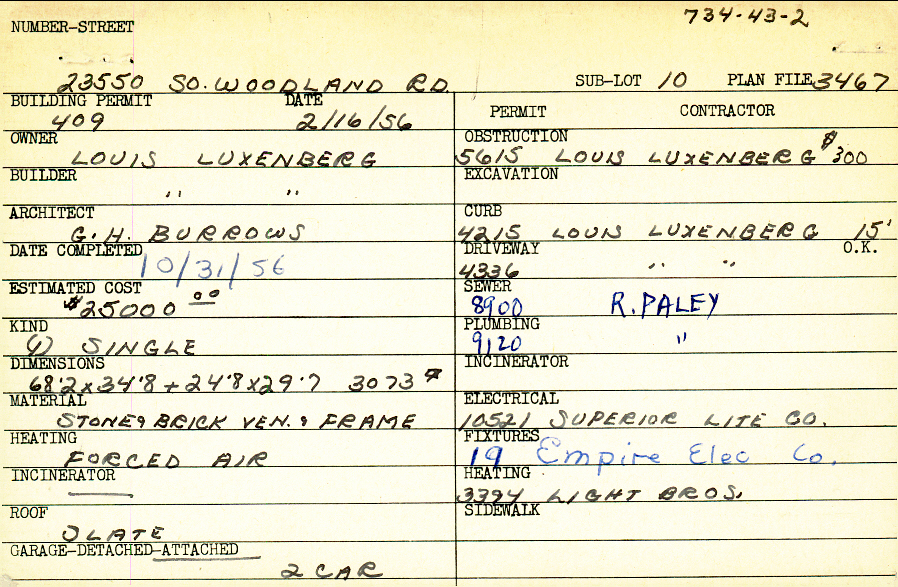 23550 South Woodland Road Shaker Heights, OH 44122 PARCEL ID: 734-43-002 Building Permit Date: 02-16-1956 Plan File Number: 1480 scanned, 3467, 4121, 5956 Microfilm Roll: Roll017, Roll#51, Roll#61, Roll#80 Neighborhood: Mercer Owner: Luxenberg, Louis Builder: Luxenberg, Louis Architect: Burrows, G. H. Estimated Cost: 25000 Date Completed: 10-31-1956 Kind: Single, Single Residence or Dwelling Material: Stone and Brick Veneer and Frame Heating: Forced Air Roof: Slate Garage: attached 2 car |
