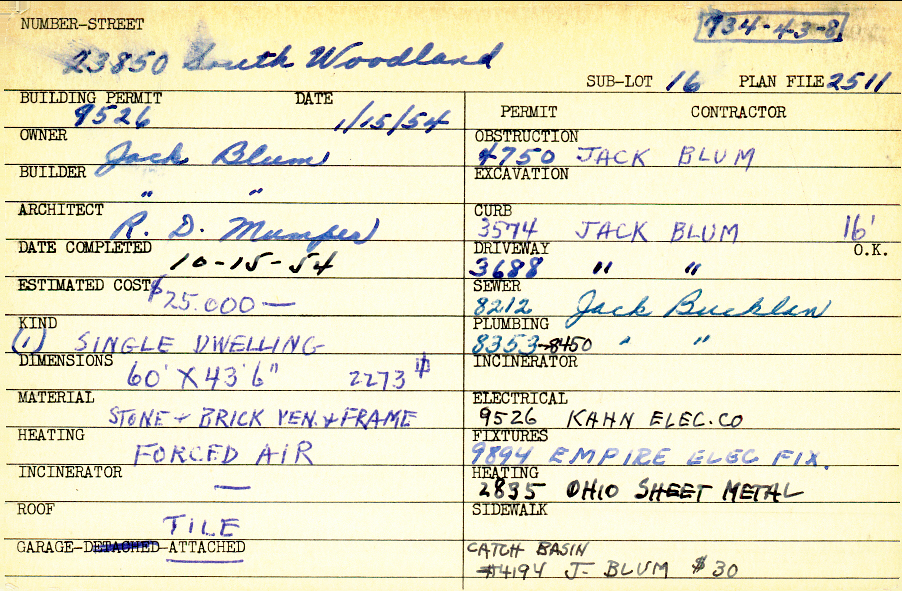 23850 South Woodland Road Shaker Heights, OH 44122 PARCEL ID: 734-43-008 Building Permit Date: 01-15-1954 Plan File Number: 2511 scanned (only cover sheet), 5086, 5649 Microfilm Roll: Roll035, Roll#69, Roll#76 Neighborhood: Mercer Owner: Blum, Jack Builder: Blum, Jack Architect: Mumper, R. D. Estimated Cost: 25000 Date Completed: 10-15-1954 Kind: Single, Single Residence or Dwelling Material: Stone and Brick Veneer and Frame Heating: Forced Air Roof: Tile Garage: attached |