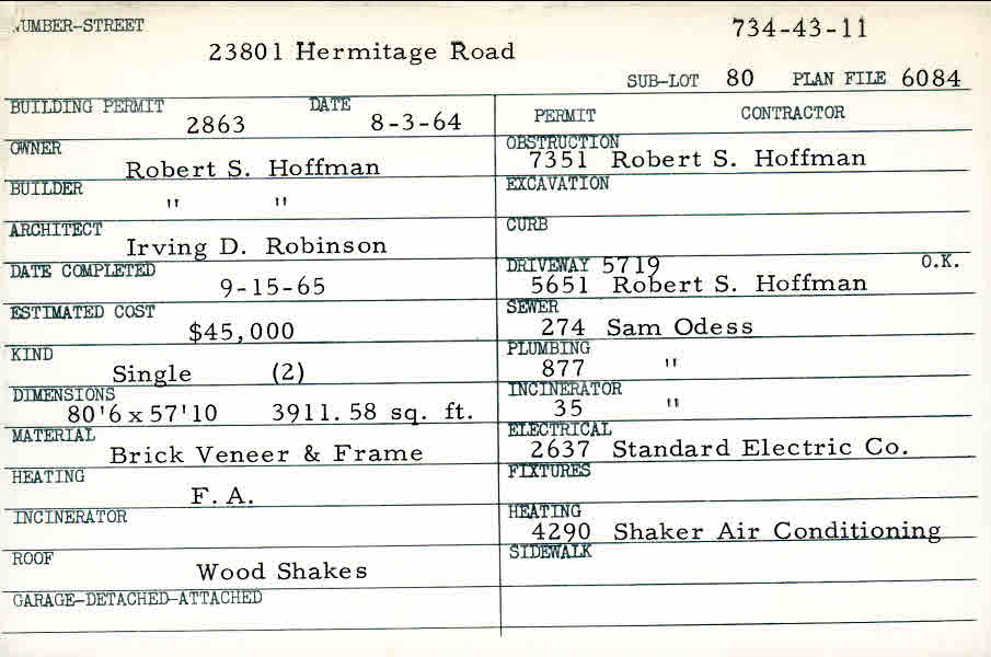 23801 Hermitage Road Shaker Heights, OH 44122 PARCEL ID: 734-43-011 Building Permit Date: 08-03-1964 Plan File Number: 6084 Microfilm Roll: Roll#81 Neighborhood: Mercer Owner: Hoffman, Robert S. Builder: Hoffman, Robert S. Architect: Robinson, Irving D. Estimated Cost: 45000 Date Completed: 09-15-1965 Kind: Single, Single Residence or Dwelling (2) Material: Brick Veneer and Frame Heating: Forced Air Roof: Wood Shakes |