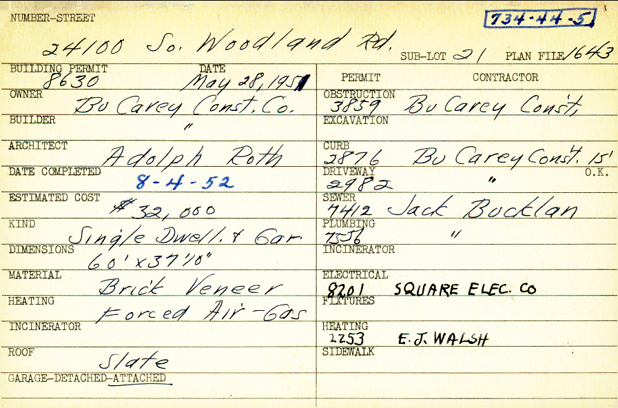 24100 South Woodland Road Shaker Heights, OH 44122 PARCEL ID: 734-44-005 Building Permit Date: 05-28-1951 Plan File Number: 1643 scanned, 3714 Microfilm Roll: Roll051 Neighborhood: Mercer Owner: Bu Carey Construction Company Builder: Bu Carey Construction Company Architect: Roth, Adolph Estimated Cost: 32000 Date Completed: 08-04-1952 Kind: Single Dwelling and Garage Material: Brick Veneer Heating: Forced Air - Gas Roof: Slate Garage: attached |
