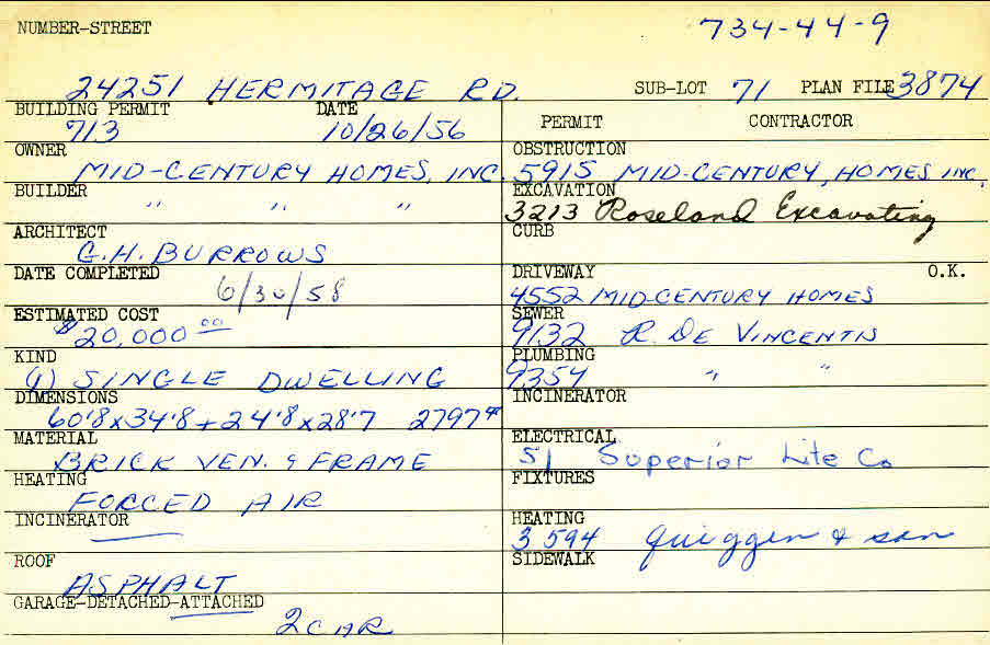 24251 Hermitage Road Shaker Heights, OH 44122 PARCEL ID: 734-44-009 Building Permit Date: 10-26-1956 Plan File Number: 3874 Microfilm Roll: Roll#56 Neighborhood: Mercer Owner: Mid-Century Homes Inc. Builder: Mid-Century Homes Inc. Architect: Burrows, G. H. Estimated Cost: 20000 Date Completed: 06-30-1958 Kind: Single, Single Residence or Dwelling Material: Brick Veneer and Frame Heating: Forced Air Roof: Asphalt Garage: attached 2 car |