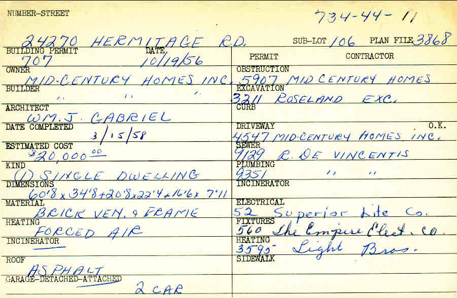 24270 Hermitage Road Shaker Heights, OH 44122 PARCEL ID: 734-44-011 Building Permit Date: 10-19-1956 Plan File Number: 3868, 6722 Microfilm Roll: Roll#56, Roll#88 Neighborhood: Mercer Owner: Mid-Century Homes Inc. Builder: Mid-Century Homes Inc. Architect: Gabriel, William J. Estimated Cost: 20000 Date Completed: 03-15-1958 Kind: Single, Single Residence or Dwelling Material: Brick Veneer and Frame Heating: Forced Air Roof: Asphalt Garage: attached 2 car |