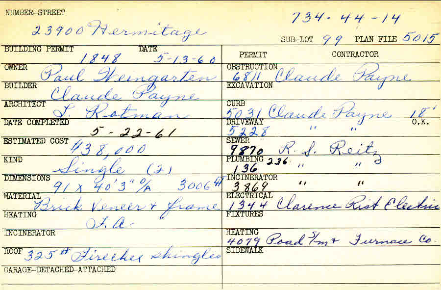 23900 Hermitage Road Shaker Heights, OH 44122 PARCEL ID: 734-44-014 Building Permit Date: 05-13-1960 Plan File Number: 5015 Microfilm Roll: Roll#69 Neighborhood: Mercer Owner: Weingarten, Paul Builder: Payne, Claude Architect: Rotman, L. Estimated Cost: 38000 Date Completed: 05-22-1961 Kind: Single, Single Residence or Dwelling (2) Material: Brick Veneer and Frame Heating: Forced Air Roof: 325# Asphalt |