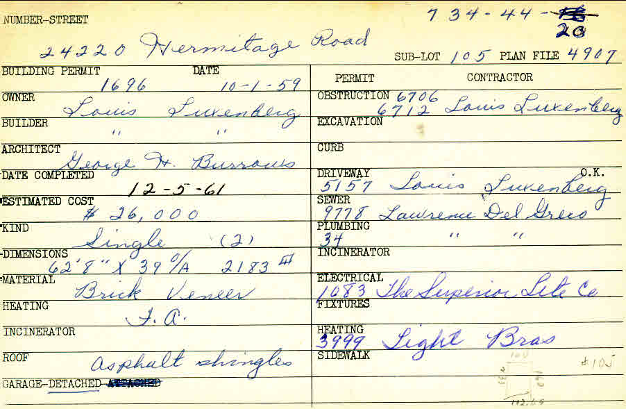 24220 Hermitage Road Shaker Heights, OH 44122 PARCEL ID: 734-44-020 Building Permit Date: 10-01-1959 Plan File Number: 4907 Microfilm Roll: Roll#68 Neighborhood: Mercer Owner: Luxenberg, Louis Builder: Luxenberg, Louis Architect: Burrows, George H. Estimated Cost: 26000 Date Completed: 12-05-1961 Kind: Single, Single Residence or Dwelling (2) Material: Brick Veneer Heating: Forced Air Roof: Asphalt Shingles Garage: detached |