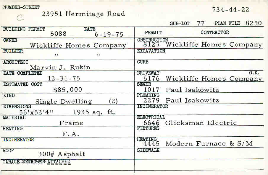 23951 Hermitage Road Shaker Heights, OH 44122 PARCEL ID: 734-44-022 Building Permit Date: 06-19-1975 Plan File Number: 8250*, 12072 Microfilm Roll: Roll#97, Roll#99, NewRoll#11 Neighborhood: Mercer Owner: Wickliffe Homes Company Builder: Wickliffe Homes Company Architect: Rukin, Marvin, J. Estimated Cost: 85000 Date Completed: 12-31-1975 Kind: Single, Single Residence or Dwelling (2) Material: Frame Heating: Forced Air Roof: 300# Min Asphalt Garage: attached |