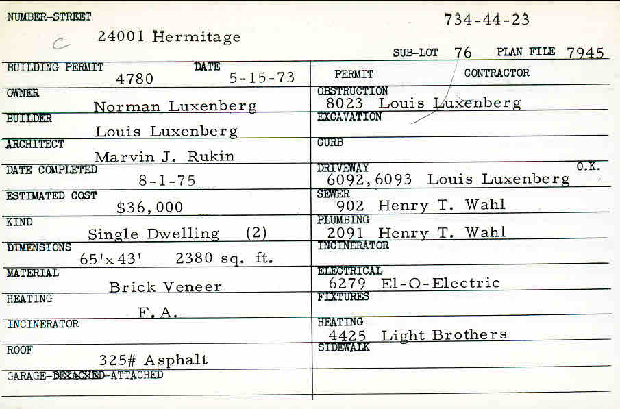 24001 Hermitage Road Shaker Heights, OH 44122 PARCEL ID: 734-44-023 Building Permit Date: 05-15-1973 Plan File Number: 7945* Microfilm Roll: Roll#95 Neighborhood: Mercer Owner: Luxenberg, Norman Builder: Luxenberg, Louis Architect: Rukin, Marvin, J. Estimated Cost: 36000 Date Completed: 08-01-1975 Kind: Single, Single Residence or Dwelling (2) Material: Brick Veneer Heating: Forced Air Roof: 325# Asphalt Garage: attached |