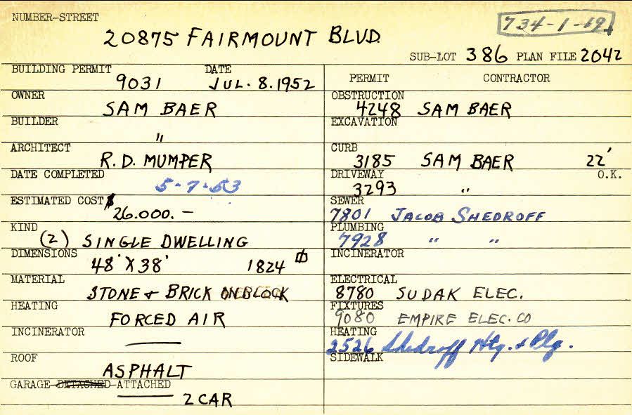 20875 Fairmount Boulevard Shaker Heights, OH 44122 PARCEL ID: 734-01-019 Building Permit Date: 07-08-1952 Plan File Number: 2042, 7028 Microfilm Roll: Roll#31, Roll#90 Neighborhood: Mercer Owner: Baer, Sam Builder: Baer, Sam Architect: Mumper, R. D. Estimated Cost: 26000 Date Completed: 05-07-1953 Kind: Single, Single Residence or Dwelling (2) Material: Stone and Brick on Block Heating: Forced Air Roof: Asphalt Garage: attached 2 car |