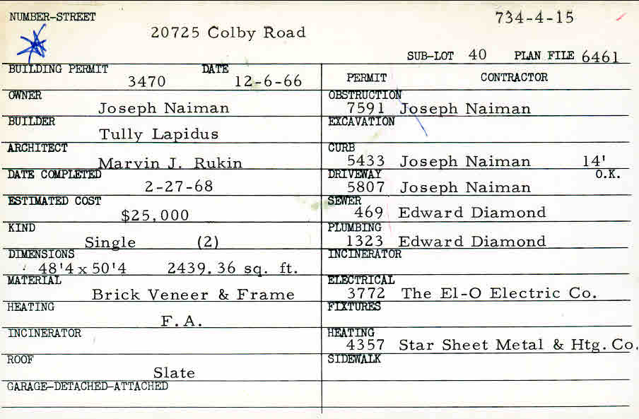 20725 Colby Road Shaker Heights, OH 44122 PARCEL ID: 734-04-015 Building Permit Date: 12-06-1966 Plan File Number: 6461, 7556 Microfilm Roll: Roll#86, Roll#93 Neighborhood: Mercer Owner: Naiman, Joseph Builder: Lapidus, Tully Architect: Rukin, Marvin J. Estimated Cost: 25000 Date Completed: 02-27-1968 Kind: Single, Single Residence or Dwelling (2) Material: Brick Veneer and Frame Heating: Forced Air Roof: Slate |