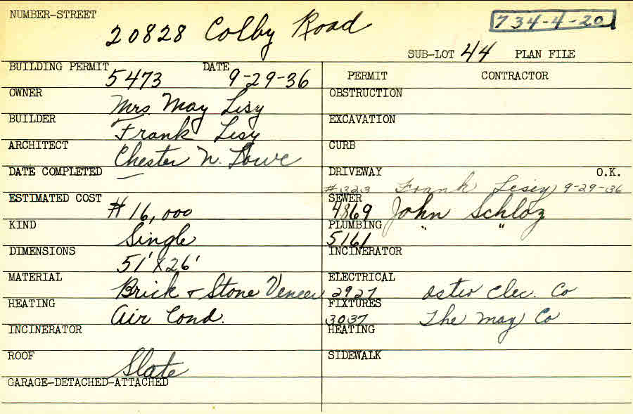 20828 Colby Road Shaker Heights, OH 44122 PARCEL ID: 734-04-020 Building Permit Date: 09-29-1936 Plan File Number: 0 Neighborhood: Mercer Owner: Lisy, Mrs. May Builder: Lisy, Frank Architect: Lowe, Chester N. Estimated Cost: 16000 Kind: Single, Single Residence or Dwelling Material: Brick and Stone Veneer Heating: Air Conditioned Roof: Slate Card Available: yes |