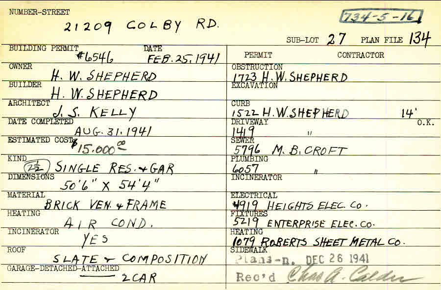 21209 Colby Road Shaker Heights, OH 44122 PARCEL ID: 734-05-016 Building Permit Date: 02-25-1941 Plan File Number: 1815, 1838 all scanned Microfilm Roll: Roll027 Neighborhood: Mercer Owner: Shepherd, H. W. Builder: Shepherd, H. W. Architect: Kelly, John Sherwood Estimated Cost: 15000 Date Completed: 08-31-1941 Kind: Single 2-1/2 Material: Brick Veneer and Frame Heating: Air Conditioned Roof: Slate Garage: attached 2 car |