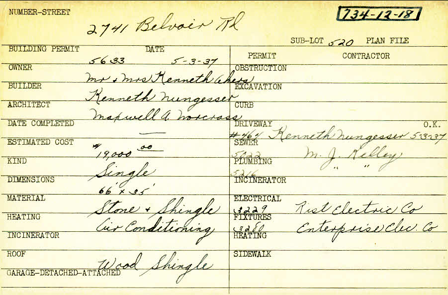 2741 Belvoir Boulevard Shaker Heights, OH 44122 PARCEL ID: 734-12-018 Building Permit Date: 05-03-1937 Plan File Number: 0 Neighborhood: Mercer Owner: Ahers, Mr. and Mrs. Kenneth Builder: Nungesser, Kenneth Architect: Norcross, Maxwell A. Estimated Cost: 19000 Kind: Single, Single Residence or Dwelling Material: Stone and Shingle Heating: Air Conditioned Roof: Wood Shingle |