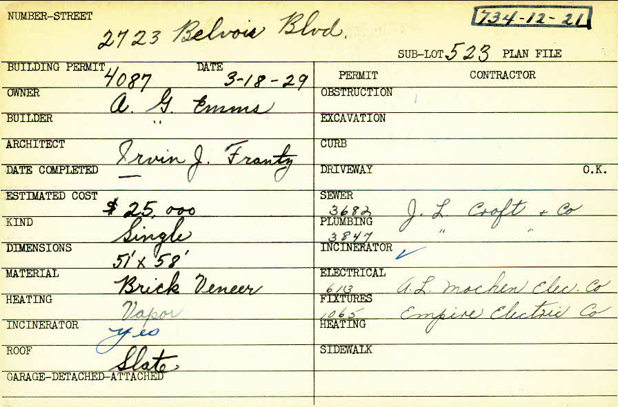 2723 Belvoir Boulevard Shaker Heights, OH 44122 PARCEL ID: 734-12-021 Building Permit Date: 03-18-1929 Plan File Number: 12416 Microfilm Roll: NewRoll#13 Neighborhood: Mercer Owner: Emms, A. G. Builder: Emms, A. G. Architect: Frantz, Irvin J. Estimated Cost: 25000 Kind: Single, Single Residence or Dwelling Material: Brick Veneer Heating: Vapor Roof: Slate |