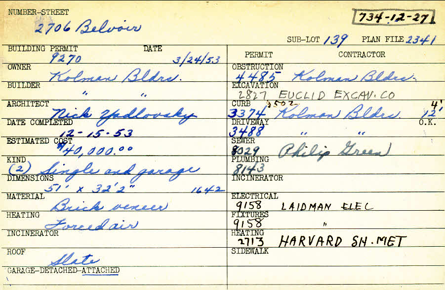 2706 Belvoir Boulevard Shaker Heights, OH 44122 PARCEL ID: 734-12-027 Building Permit Date: 03-24-1953 Plan File Number: 1073 scanned, 2341 Microfilm Roll: Roll013, Roll#34 Neighborhood: Mercer Owner: Kolman Builders Builder: Kolman Builders Architect: Yadlovsky, Nick Estimated Cost: 40000 Date Completed: 12-15-1953 Kind: Single Dwelling and Garage (2) Material: Brick Veneer Heating: Forced Air Roof: Slate Garage: attached |