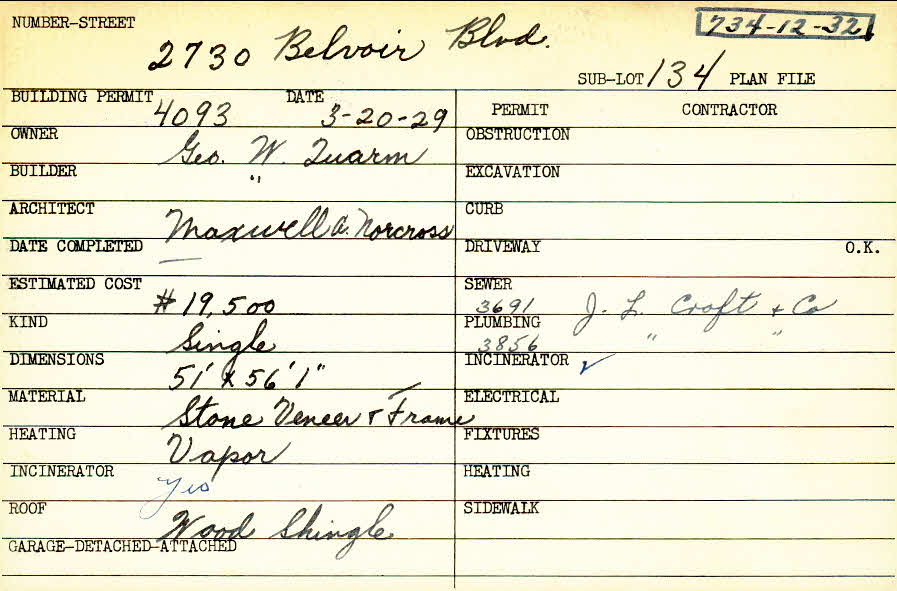 2730 Belvoir Boulevard Shaker Heights, OH 44122 PARCEL ID: 734-12-032 Building Permit Date: 03-20-1929 Plan File Number: 12837 Microfilm Roll: NewRoll#18 Neighborhood: Mercer Owner: Quarm, George W. Builder: Quarm, George W. Architect: Norcross, Maxwell A. Estimated Cost: 19500 Kind: Single, Single Residence or Dwelling Material: Stone Veneer and Frame Heating: Vapor Roof: Wood Shingle |