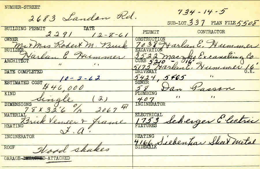 2683 Landon Road Shaker Heights, OH 44122 PARCEL ID: 734-14-005 Building Permit Date: 12-08-1961 Plan File Number: 5508, 9710 Microfilm Roll: Roll#75, Roll#104 Neighborhood: Mercer Owner: Buck, Mr. and Mrs. Robert M. Builder: Hummer, Harlan E. Architect: Hummer, Harlan E Estimated Cost: 46000 Date Completed: 10-02-1962 Kind: Single, Single Residence or Dwelling (2) Material: Brick Veneer and Frame Heating: Forced Air Roof: Wood Shakes Garage: attached |