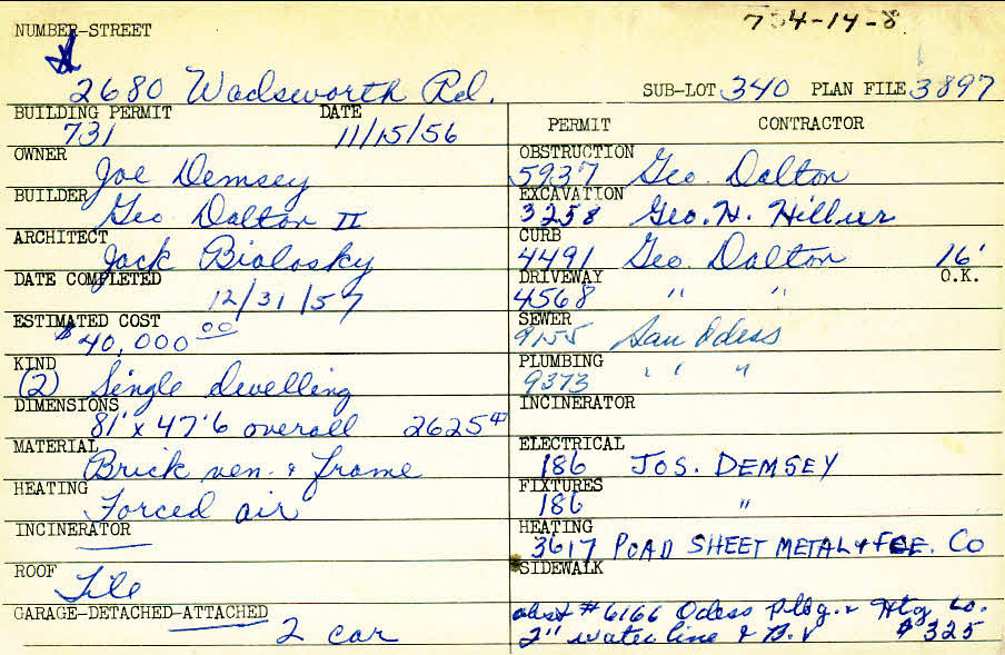 2680 Wadsworth Road Shaker Heights, OH 44122 PARCEL ID: 734-14-008 Building Permit Date: 11-15-1956 Plan File Number: 3897 Microfilm Roll: Roll#57 Neighborhood: Mercer Owner: Demsey, Joe Builder: Dalton, George II Architect: Bialosky, Jack A. Estimated Cost: 40000 Date Completed: 12-31-1957 Kind: Single, Single Residence or Dwelling (2) Material: Brick Veneer and Frame Heating: Forced Air Roof: Tile Garage: attached 2 car |