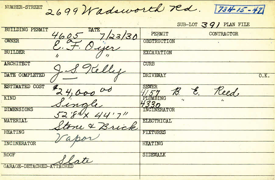 2699 Wadsworth Road Shaker Heights, OH 44122 PARCEL ID: 734-15-047 Building Permit Date: 07-23-1930 Plan File Number: 417 scanned, 5368 Microfilm Roll: Roll004, Roll#73 Neighborhood: Mercer Owner: Oyer, Earl F. Builder: Oyer, Earl F. Architect: Kelly, John Sherwood Estimated Cost: 24000 Kind: Single, Single Residence or Dwelling Material: Stone and Brick Heating: Vapor Roof: Slate |