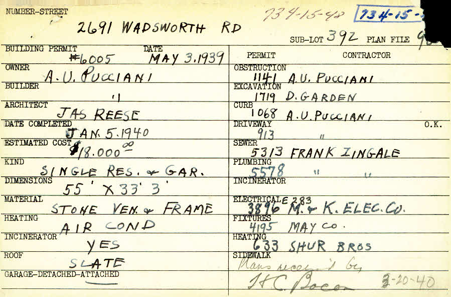 2691 Wadsworth Road Shaker Heights, OH 44122 PARCEL ID: 734-15-048 Building Permit Date: 05-03-1939 Plan File Number: 12755 Microfilm Roll: NewRoll#14 Neighborhood: Mercer Owner: Pucciani, A. U. Builder: Pucciani, A. U. Architect: Reese, James A. Estimated Cost: 18000 Date Completed: 01-05-1940 Kind: Single Dwelling and Garage Material: Stone Veneer and Frame Heating: Air Conditioned Roof: Slate Garage: attached |