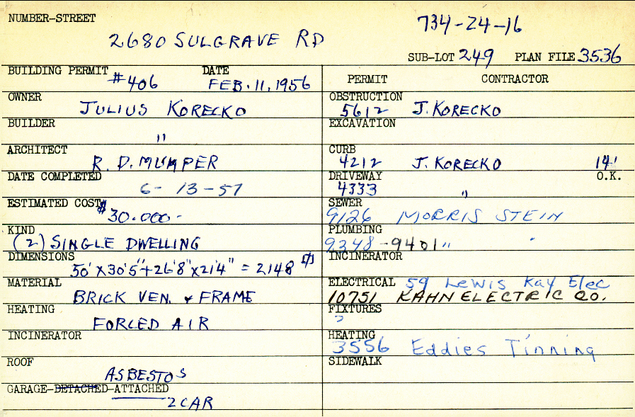 2680 Sulgrave Road Shaker Heights, OH 44122 PARCEL ID: 734-24-016 Building Permit Date: 02-11-1956 Plan File Number: 3536 Microfilm Roll: Roll#52 Neighborhood: Mercer Owner: Korecko, Julius Builder: Korecko, Julius Architect: Mumper, R. D. Estimated Cost: 30000 Date Completed: 06-13-1957 Kind: Single, Single Residence or Dwelling (2) Material: Brick Veneer and Frame Heating: Forced Air Roof: Asbestos Garage: attached 2 car |