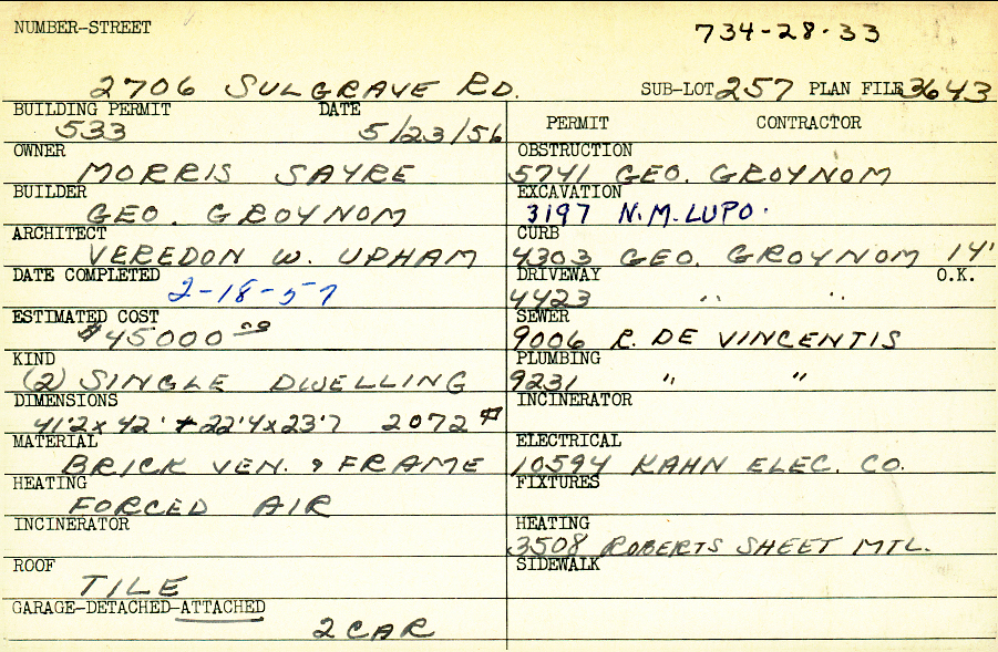 2706 Sulgrave Road Shaker Heights, OH 44122 PARCEL ID: 734-28-033 Building Permit Date: 05-23-1956 Plan File Number: 3643 Microfilm Roll: Roll#54 Neighborhood: Mercer Owner: Sayre, Morris Builder: Groynom, George Architect: Upham, Veredon W. Estimated Cost: 45000 Date Completed: 02-18-1957 Kind: Single, Single Residence or Dwelling (2) Material: Brick Veneer and Frame Heating: Forced Air Roof: Tile Garage: attached 2 car |