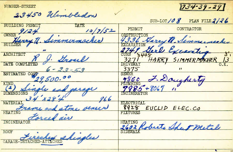 23450 Wimbledon Road Shaker Heights, OH 44122 PARCEL ID: 734-39-029 Building Permit Date: 10-07-1952 Plan File Number: 2126, 5366 Microfilm Roll: Roll#32, Roll#73 Neighborhood: Mercer Owner: Simmermacher, Henry U. Builder: Simmermacher, Henry U. Architect: Grosel, R. J. Estimated Cost: 29500 Date Completed: 06-23-1953 Kind: Single Dwelling and Garage (2) Material: Frame and Stone Veneer Heating: Forced Air Roof: Shingles Garage: attached |