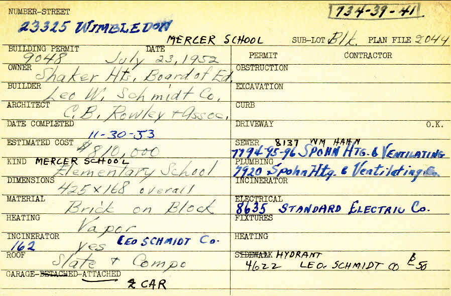 23325 Wimbledon Road Shaker Heights, OH 44122 PARCEL ID: 734-39-041 Building Permit Date: 07-23-1952 Plan File Number: 2044, 3969, 7259 scanned, 8945-8946-8947 scanned Microfilm Roll: Roll#58, Roll092, Roll098 Neighborhood: Mercer Owner: Shaker Heights Board of Education Builder: Leo W. Schmidt Company Architect: C. B. Rowley and Associates Estimated Cost: 810000 Date Completed: 11-30-1953 Kind: Government and Municipal (incl. Schools) Material: Brick on Block Heating: Vapor Roof: Slate Garage: attached 2 car |