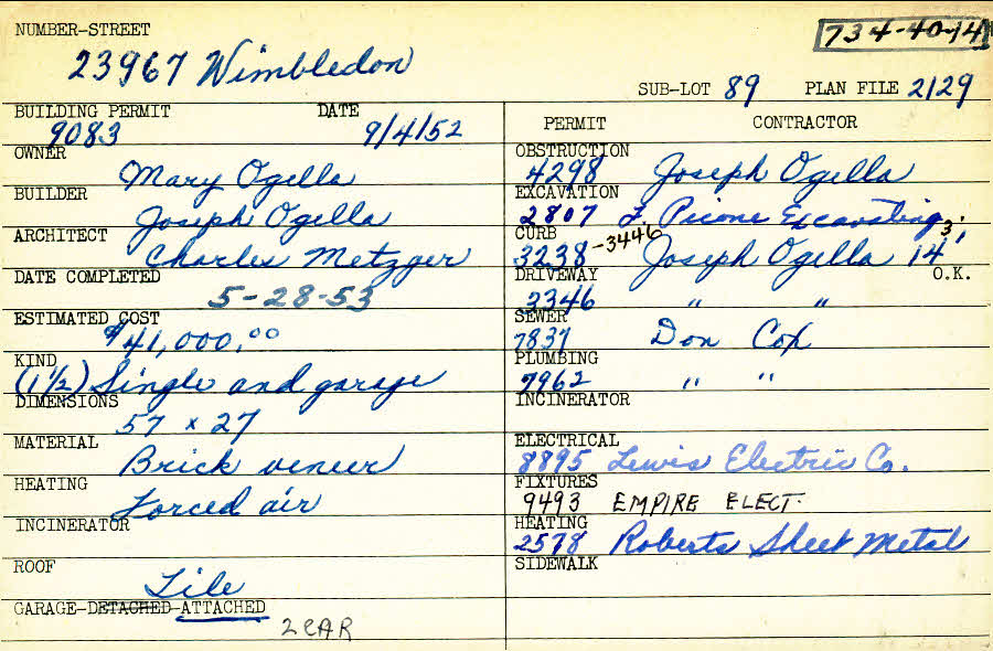 23967 Wimbledon Road Shaker Heights, OH 44122 PARCEL ID: 734-40-014 Building Permit Date: 09-04-1952 Plan File Number: 2129 Microfilm Roll: Roll#32 Neighborhood: Mercer Owner: Ogella, Mary Builder: Ogella, Joseph Architect: Metzger, Charles A. Estimated Cost: 41000 Date Completed: 05-28-1953 Kind: Single Dwelling and Garage Material: Brick Veneer Heating: Forced Air Roof: Tile Garage: attached 2 car |