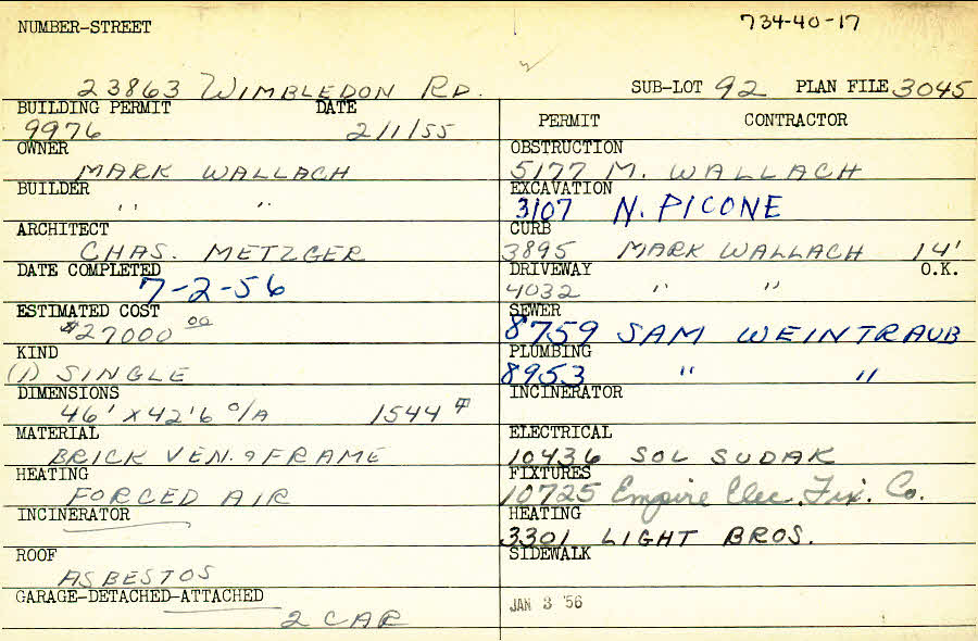 23863 Wimbledon Road Shaker Heights, OH 44122 PARCEL ID: 734-40-017 Building Permit Date: 02-01-1955 Plan File Number: 3045 Microfilm Roll: Roll#43 Neighborhood: Mercer Owner: Wallach, Mark Builder: Wallach, Mark Architect: Metzger, Charles A. Estimated Cost: 27000 Date Completed: 07-02-1956 Kind: Single, Single Residence or Dwelling Material: Brick Veneer and Frame Heating: Forced Air Roof: Asbestos Garage: attached 2 car |
